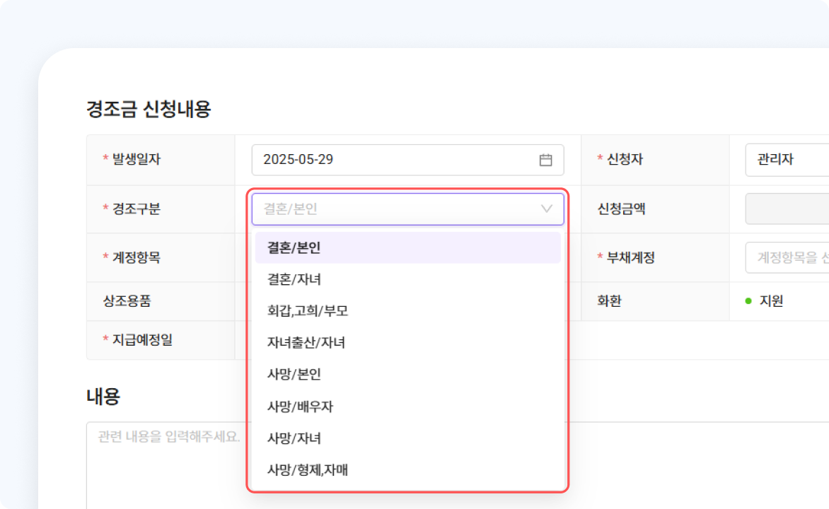 경조금 기능은 전자결재 양식 기반으로 등록 및 관리하여, 누락 없이 공정하고 체계적으로 운영할 수 있습니다.