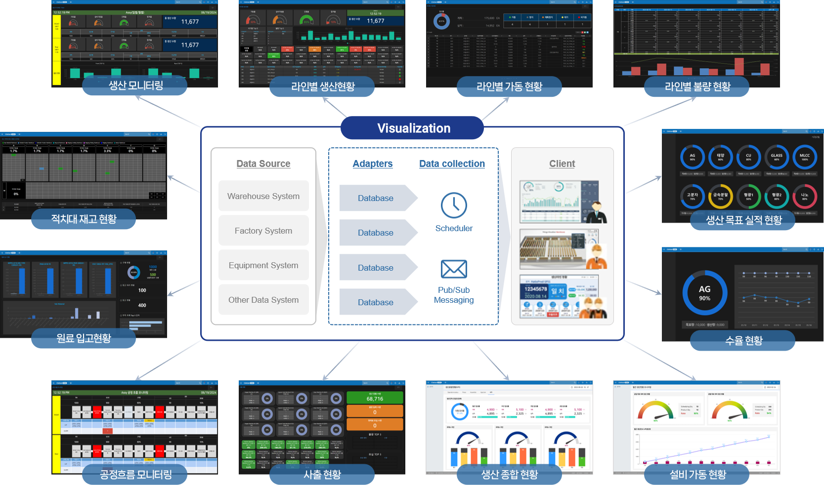 Cleber.VIS는 MES로 부터 수집 및 가공된 생산, 품질 등의 데이터를 시각화 하여 현장 PC나 TV 등의 디스플레이를 통해 보이는 현황판(DashBoard)을 개발하는 제품입니다.
