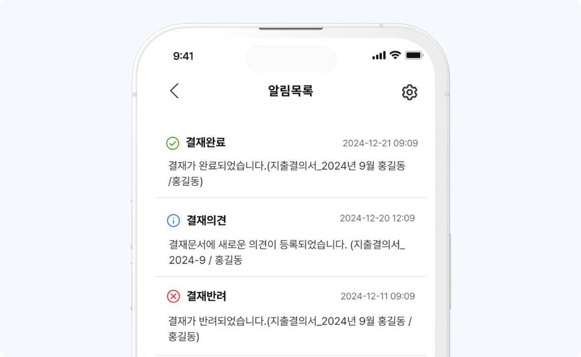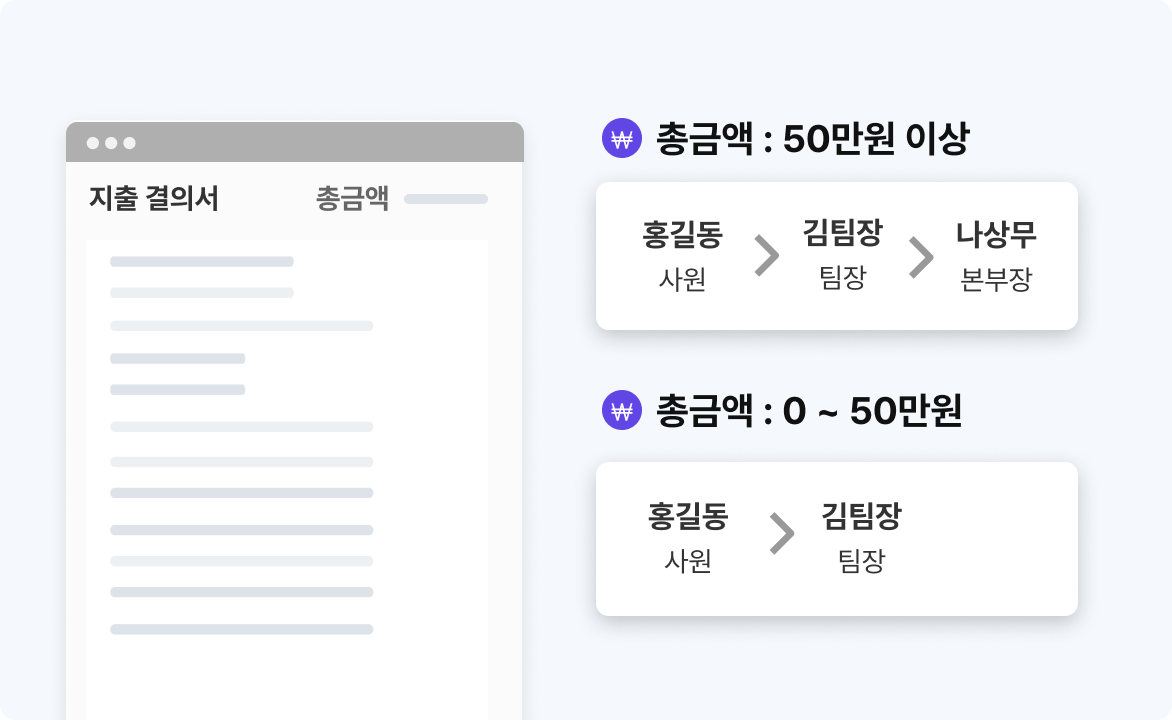 모든 전표 유형에 대해 조직도 기반 결재 라인을 자동 구성하고, 승인자별 결재 이력과 코멘트를 기록하며 전표와 함께 보관됩니다.
