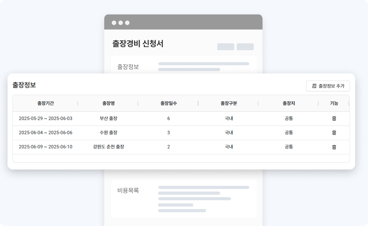 특히, 하나의 출장 신청서로 여러 지역, 일정, 지출 항목을 함께 관리할 수 있으며,