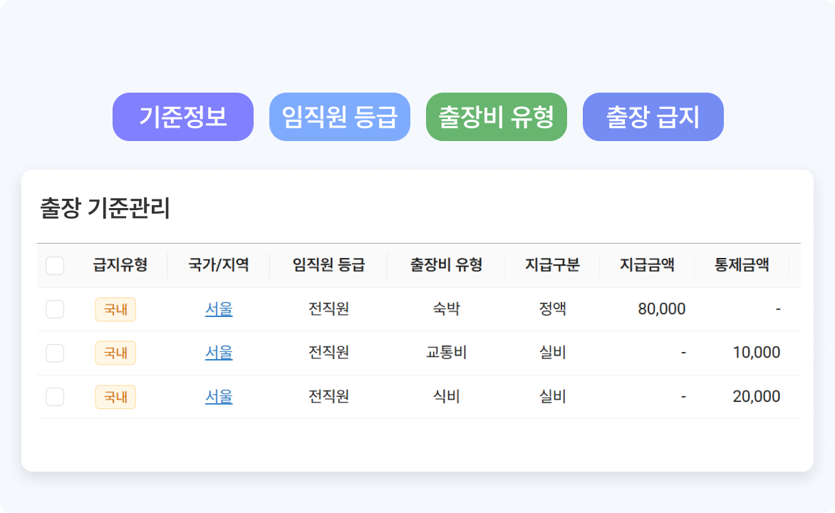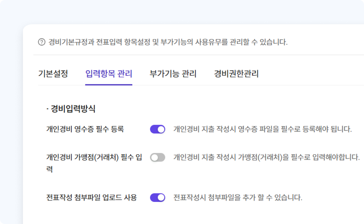 기준정보관리 기능은 경비처리, 전자결재, 회계처리 등에 필요한 기초 규칙과 항목 데이터를 설정 및 관리하는 기능입니다.