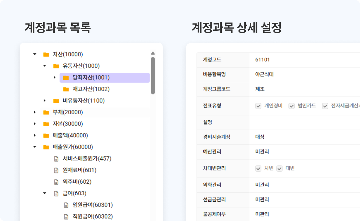 계정과목, 비용항목, 거래처, 프로젝트부터 결재방식, 검인 라인까지 모든 전표 흐름의 구조적 기반을 정의하며,