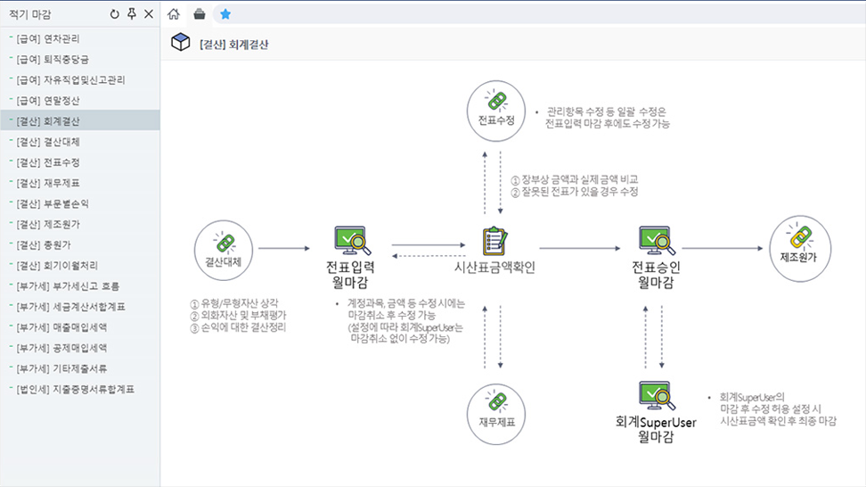기업의 적기 마감을 위한 마감 프로세스를 단계별로 시각화 하여